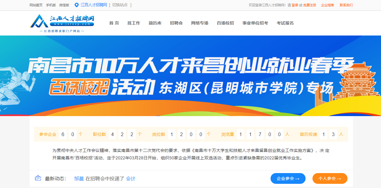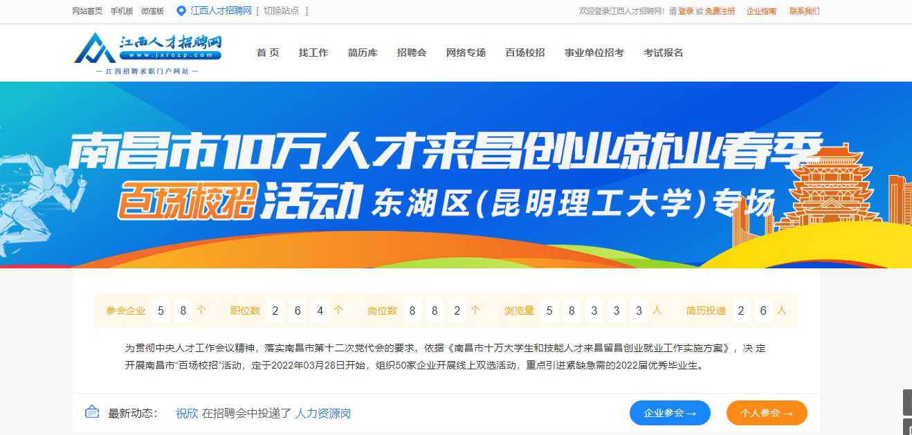 1、在江西人才招聘網(wǎng) www.jxrczp.com已上“網(wǎng)絡(luò)專場”、“百場校招”兩個主題板塊宣傳。主題名為:2022年東湖區(qū)走進(jìn)(昆明城市學(xué)院)、2022年東湖區(qū)走進(jìn)(昆明理工大學(xué))。