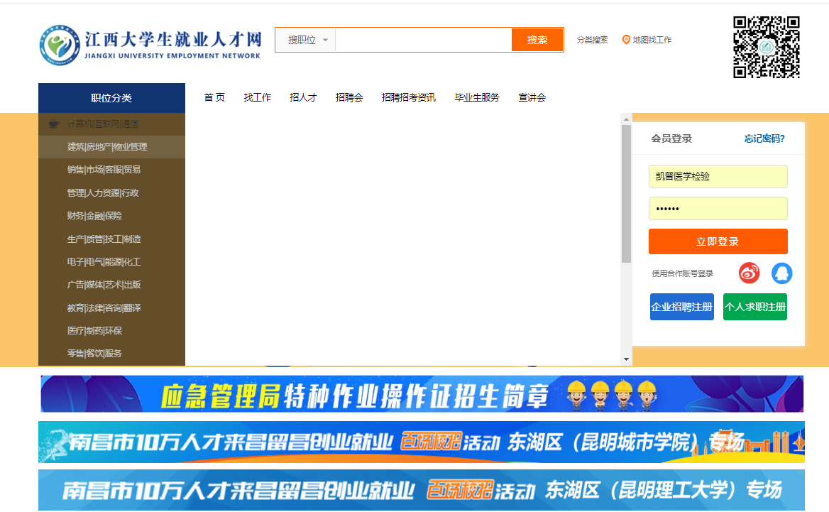 2、在江西大學(xué)生就業(yè)人才網(wǎng)www.jxujob.com已上首頁通欄廣告兩條:百場校招活動——(昆明城市學(xué)院和昆明理工大學(xué))。